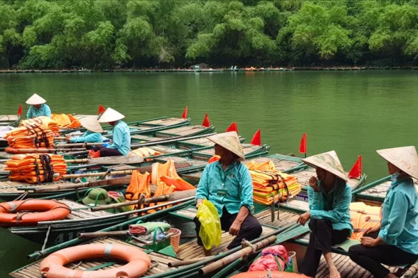 The bus takes you to Trang An, on a boat to visit Trang An eco-tourism area - where limestone strips, valleys and rivers intertwine to create a fanciful and mysterious space. Sitting on a boat to visit caves with very special stalactite shapes such as: Dark cave, Light cave, wine-making cave, Sinh cave, Si cave, Ba Giot cave, Dia Linh cave…